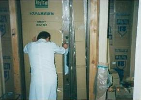 ○気密測定中にお施主様が玄関ドアを開けるようす。