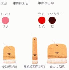| 白塗り(立役) かつら下羽二重は二重です。月代の部分はアクアカラー(スカイブルー)です。化粧順序は、女形と同じです。 ぼかし紅は、トノコ2Mです。 紅は、5Aです。強い男役は、12です。 ![]() |